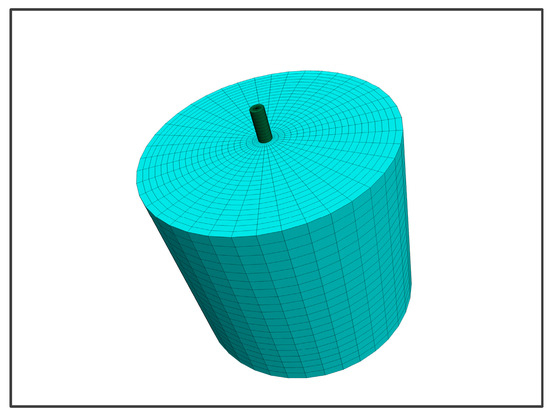 This paper employs the FLAC3D 6.0 finite difference software for numerical simulation. The numerical simulation matches the size of the indoor test specimens, and the ratio of the diameter of the test samples to the anchor body should be no less than five, which can effectively reduce the impact of boundary constraint effects. The model consists of two parts: the anchor body and the soil. The soil layer is silty sand, and the soil constitutive model uses an elastic−plastic model, with the elastic part described by a linear elastic model and the plastic part replaced by the Mohr−Coulomb model. The soil has a diameter of 15 cm and a height of 12 cm. The anchor body is simulated using an elastic model, and the effect of density on the gravitational field is neglected, as shown in Figure 9. The simulation is validated by shear tests on specimens with a 50% sand content, and the material parameter assignments are listed in Table 5. The soil is constrained vertically on all sides and the bottom. To prevent model oscillation due to the initial application of force, given the small size of the specimen model, the simulation process uses velocity loading. During the velocity loading process, the velocity does not remain constant; it starts from zero and increases with a constant slope to prevent excessive displacement at the beginning that could damage the model before then maintaining a predetermined value.