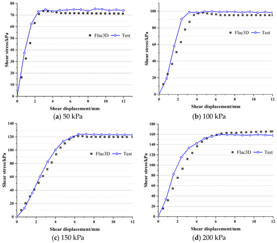 Figure 10 shows the variation in shear stress for the anchor under four different confining pressures of 50, 100, 150, and 200 kPa, both in simulation and actual measurement. It can be observed from the figure that the simulated curves match well with the actual measured data points. Both simulation analysis and field measurement data consistently show that there is a positive correlation between the pull-out resistance of the anchor.