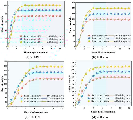 To study the effect of confining pressure on the shear characteristics of the anchor-soil interface, Figure 7 shows the shear stress-displacement curves of soils with sand contents of 50%, 55% and 60%. In the corresponding legends, the value in the first column represents the number of freeze-thaw cycles, the value in the second column is the sand content, the value in the third column is the size of the applied confining pressure, and the curves in the figures are fitted curves.