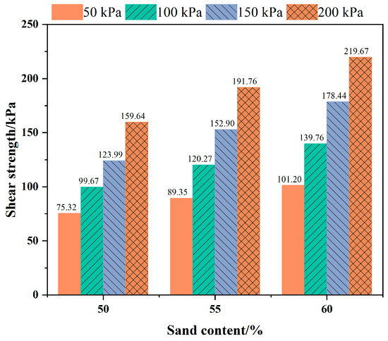 As can be seen from the shear displacement curves in Figure 11, under the same confining pressure, an increase in sand content drives the increase in the shear strength of the anchor-soil interface and slightly increases the corresponding peak displacement, and the shear strength is positively correlated with the confining pressure. As shown in Figure 12, under the condition of 50 kPa, the shear strengths of the anchor-soil interfaces for specimens with a 50% sand content, 55% sand content, and 60% sand content are 75.32 kPa, 89.35 kPa, and 101.20 kPa, which are 1.19 times and 1.35 times higher than that for a specimen with a 50% sand content, respectively. The anchor-soil interface shear strength of a specimen with a 55% sand content increases by 14.02 kPa compared with that with a 50% sand content, and those with a 60% sand content increase by 11.84 kPa compared with those with a 55% sand content. The increase in sand content leads to a gradually diminishing increment in shear strength.