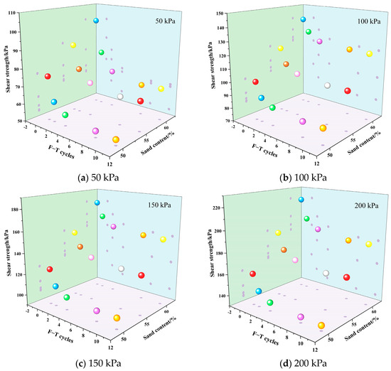 Figure 13 displays three-dimensional scatter plots illustrating the variation in contact surface shear strength across different levels of confining pressures and varying numbers of freeze-thaw cycles.