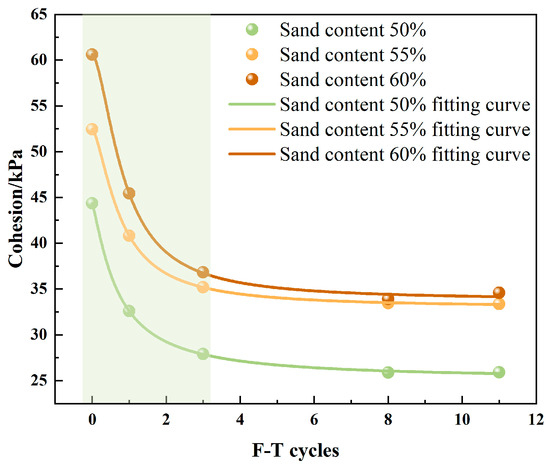 Figure 14 shows the damage curve of cohesion at the anchor-soil interface under freeze-thaw cycles; with the increase in the number of freeze-thaw cycles, the cohesion decreases, and the cohesion decreases the most with the first freeze-thaw cycle. The cohesions of the specimens with sand contents of 50%, 55% and 60% decrease by 26.2%, 21.6%, and 23.9%, respectively. After the first three freeze-thaw cycles, the soil damage is basically completed, and the cohesion of the specimens with 50%, 55%, and 60% sand contents decreases by 35.3%, 32.4%, and 39.4%, respectively. Then, as the number of freeze-thaw cycles continues to increase, the cohesion decreases slightly, and the cohesion remains stable after eight cycles. When not subjected to freezing and thawing, the cohesive forces of the specimens with 50%, 55% and 60% sand content are 45.33 kPa, 53.60 kPa and 61.24 kPa, respectively. As the sand content of the specimen increases, the volume and surface area of sand also increase, leading to a larger contact area between the particles. This results in a greater distribution of the water film on the surface of the sand particles, which in turn generates a higher adhesive cohesion.