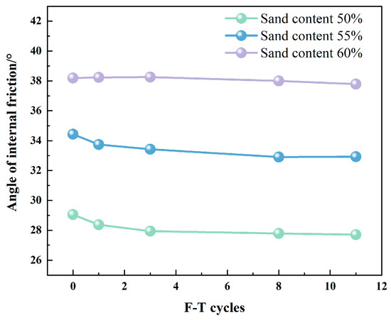 Figure 15 shows the curve of the variation in the internal friction angle. The internal friction angle is affected by the first few freeze-thaw cycles, but only slightly. The internal friction angle does not change much during the freeze-thaw process, the internal friction angle of the soil with a 50% sand content decreases from 29.1° to 27.7°, the internal friction angle of the soil with a 55% sand content decreases from 34.2° to 32.9°, and the internal friction angle of the soil with a 60% sand content decreases from 38.2° to only 37.9°. In general, under the action of freeze-thaw cycles, the internal friction angle at the anchor-soil interface of samples with different sand content will slightly decrease, but the decrease is not significant.