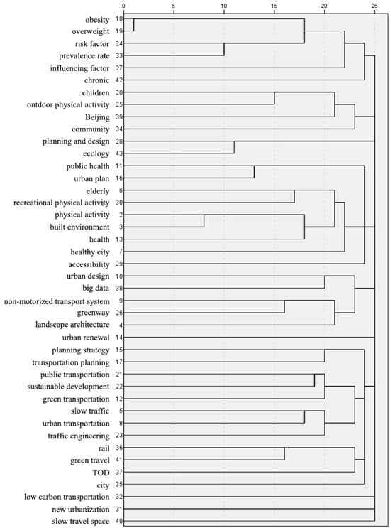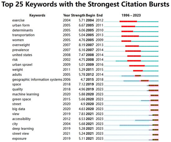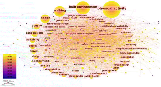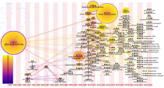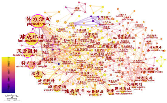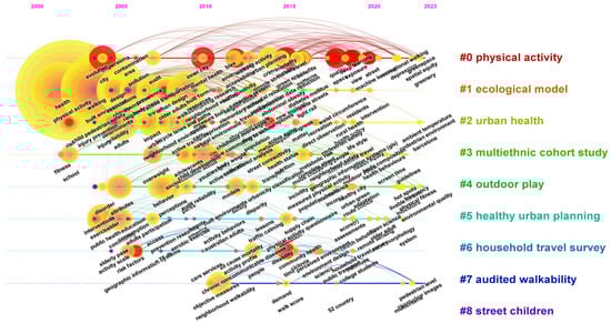 - Studying the impact of urban environmental hygiene on outdoor physical activity among the public. This topic includes seven high-frequency keywords such as “exercise”, “public health”, and “transportation”. Urban environmental hygiene primarily refers to natural and social environmental factors including air, water, soil, urban and rural planning, and living conditions. Research in this area focuses on issues such as climate change [94], sky view factor (SVF), an effective indicator describing urban radiation and the thermal environment [95], air quality [96], and other aspects of urban physical environments to analyse their impact on outdoor physical activity among the public.