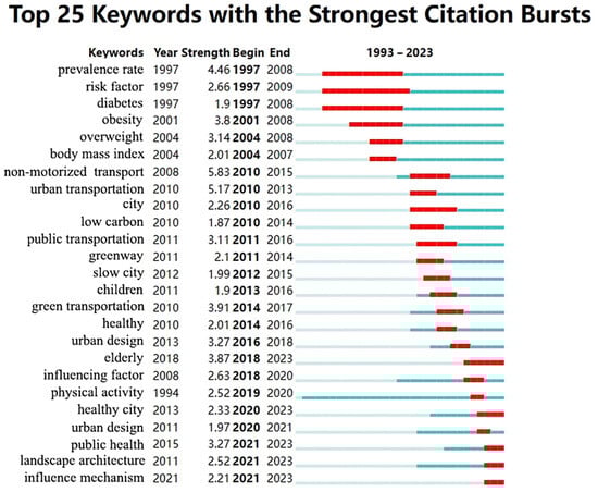 - Exploring urban transportation systems that promote human health development. This topic primarily encompasses 18 high-frequency keywords such as “planning strategies”, “transportation planning”, and “public transportation”. Streets are essential components of urban transportation systems. Comprehensive urban transportation in China is currently undergoing a comprehensive transformation from focusing on speed to emphasizing development quality, from efficiency to resilience, from macro-level transportation and spatial structures to the integration of transit-oriented development (TOD) and station cities, and from a construction emphasis to comprehensive transformation through inventory renewal and retrofitting [155]. More and more scholars in transportation engineering and urban planning are paying attention to the impact of street environments on public health. Among the factors affecting public health in transportation systems, the expansion of road networks and the sharp increase in private vehicle ownership have led to significant issues of traffic noise and air pollution, which are important causes of chronic diseases [156]. The safety, connectivity, and walkability of streets not only promote physical activity but also have positive impacts on air quality and noise levels [157].