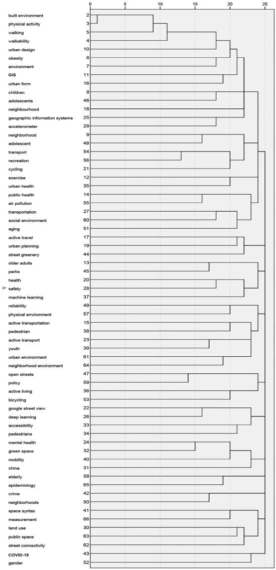 | 1 | 2, 3, 5, 4, 10, 6, 7, 11, 16, 8, 46, 18, 25, 29 | built environment, physical activity, walking, walkability, urban design, obesity, environment, GIS, urban form, children, adolescents, neighbourhood, geographic information systems, accelerometer |