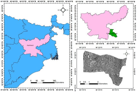 Jamshedpur is one of India’s most populated and well-planned industrial cities. Jamshedpur is in Jharkhand State’s southern region at 22°48′ N longitude and 86°12′ E latitude, as shown in Figure 1. This study area is representative of the rapidly urbanizing areas with a considerable population and a high energy demand. Jamshedpur is the center for commercial and industrial activities; one of the largest industries, Tata Iron and Steel Company (TISCO), is in the city.