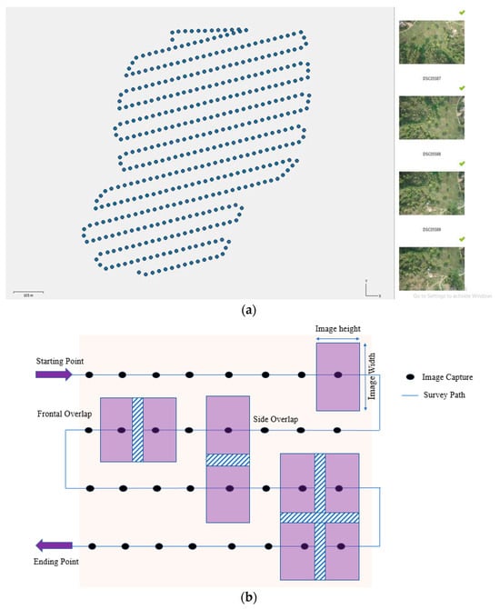 Image accruing system to maintain overlap using UAVs. (a) UAV scan path (blue dots) of each image acquired/captured. (b) Illustration of overlap in image accruing system.