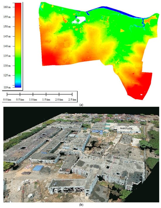 Digital surface models. (a) DTM RGB point cloud data showing the terrain elevation information. (b) The DSM point dense cloud shows all the features of the study area.