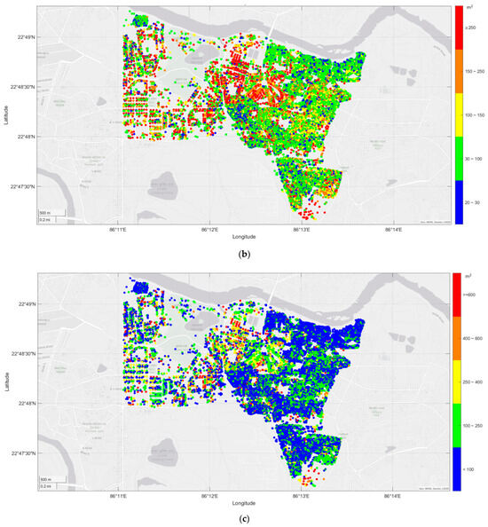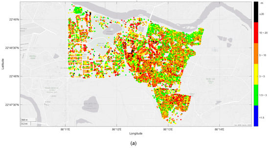 Three-dimensional city modeling can facilitate urban planning, property development, better transportation, disaster simulation, tourism development, sustainable environmental development, social and economic analysis, architecture and design, etc. []. The DEM Point Cloud data derived from the UAV survey were processed in Global Mapper software to transform raw data to obtain the Digital Surface Model (DSM) and Digital Terrain Model (DTM). DSM is a depiction of the environment’s native and artificial elements, such as trees, buildings, and other structural elements, which exist within the topographic surface of the bare earth’s surface. In contrast to DSM, which also includes all static features like vegetation, cars, and buildings, a DTM only shows the land’s surface []. The DTM point cloud having the RGB colors associated with the terrain height is shown in Figure 4a and the DSM point cloud capturing all the features in the study area is shown in Figure 4b. A Normalized Digital Surface Model (nDSM) is calculated by subtracting DTM from DSM. The Orthomosaic derived from UAV was used to extract building footprints, as shown in Figure 5. Using the centroids of each building footprint and nDSM, the corresponding height information of each building footprint is extracted [].