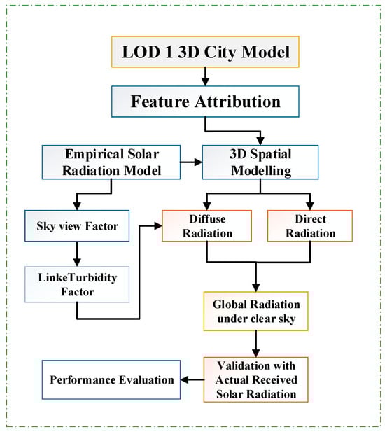 The irradiance accumulates over time and in different areas to represent the total irradiance that can be theoretically received by each wall, roof, and building during each day, month, or year. Ghouard’s model proposed empirical formulas related to astronomical parameters and atmospheric conditions [] that estimate solar radiation in the region according to the latitudes.