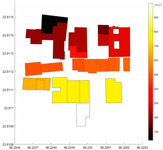 Geospatial modelling is carried out using MATLAB Mapping toolbox to estimate the theoretical solar radiation attained by the building envelopes; the effects of time-varying shading events are counted to enhance the estimation of direct irradiance and diffuse radiation by considering turbidity factors depending on atmospheric conditions [], as shown in Figure 8. MATLAB software is a powerful numerical analysis program widely used in the research community for energy modelling and solar analysis [,,]. Mapping tools are proficient in generating high-quality graphical displays of geospatial data. The toolbox provides functions and user interfaces to import, create, manipulate, simulate, and represent geospatial data [,,].