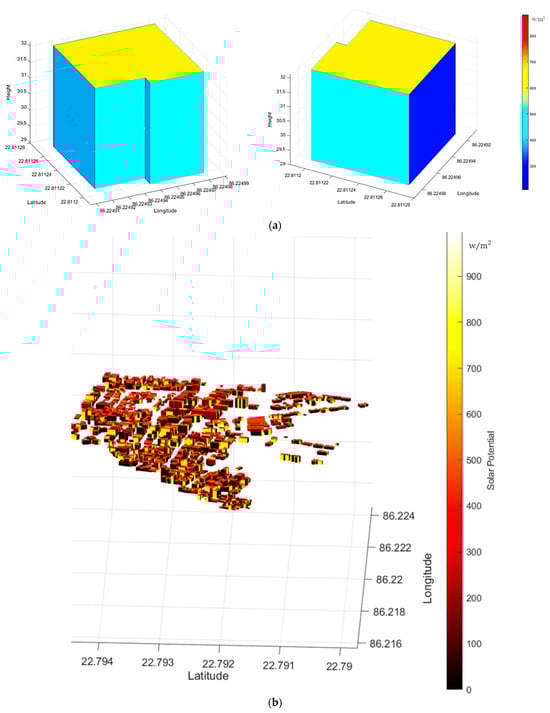 Simulation outputs of solar radiation on building envelopes. (a) Three-dimensional map view of solar radiation on single selected building at 11 a.m. on 22 February 2023. (b) Three-dimensional map view of solar potential on set of building at 8 a.m. on 1 June 2023.