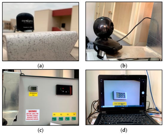 An experimental setup will be used to record the actual solar irradiance of the region. (a) Pyranometer. (b) Webcam. (c) Pyranometer reading. (d) Laptop.