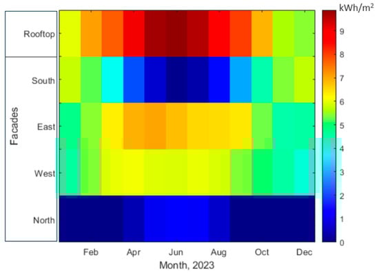Computed average monthly global solar irradiation on rooftops and facades.