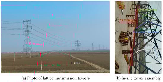 Steel lattice transmission towers are vital lifeline projects to provide telecommunication or power transmission, as shown in Figure 1a. Consequently, their safety and reliability dominate the design [,,]. In transmission tower structural engineering applications, angle steel components are predominantly interconnected using single-limb bolted connections, thereby constituting compression-bending elements [,]. Although this form of straightforward connection facilitates ease of construction and installation, the load-bearing conditions of the members are complex, primarily manifesting in two aspects. On one aspect, the load-bearing axis does not coincide with the principal centroidal axis of the cross-section, resulting in bidirectional eccentricity. This phenomenon, in turn, renders the determination of the bending axis direction during angle steel instability a nontrivial task []. On another aspect, the determination of end-constraint conditions poses challenges. As such, the single-angle steel compression strut, being the most frequently employed element within transmission towers, substantiates a pivotal control condition during angle steel design, aiming to forestall instability under compressive loading. Axially loaded elements, when characterized by low slenderness ratios, are susceptible to flexural–torsional instability failure. Conversely, elements characterized by high slenderness ratios are prone to buckling-induced flexural instability failure. In transmission tower structures, diagonal members and leg members are typically connected with single-sided angle steel, with their load-carrying capacity being significantly influenced by eccentricity and constraint effects. Investigations into the ramifications of eccentricity have been undertaken extensively.