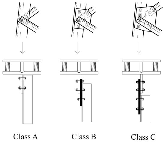 Experimental results in the literature [] are used to make comparisons between the test and calculated results from design standards. Three types of connections are used to simulate different boundary conditions, as shown in Figure 3. For Class A connection, the test specimen is directly connected to the leg member with two bolts, resulting in good restraint effects. For Class B connections, the test specimen is connected to the leg member via a gusset plate. One bolt is directly connected to the leg member, resulting in a larger eccentricity but allowing for a reduction in gusset plate dimensions. Class C connections also employed a gusset plate to link the test specimen to the leg member, with the smallest eccentricity but with a larger gusset plate. The test parameters of three types of specimens are presented in Table 2. The Class A connection is suitable for larger leg member joints, while the Class B and Class C connections are suitable for joints with smaller leg member specifications. The experimental results are shown in Table 3.
