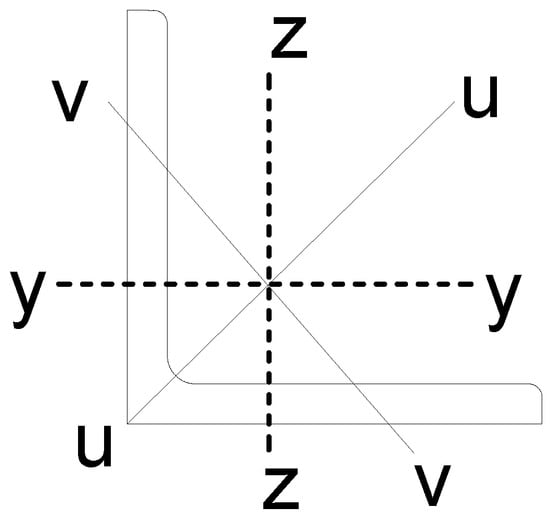 Notations of the steel angle section. yy/zz: geometric axis of the cross-section parallel to the leg; uu: major/strong principal axis (associated with weak axis displacement); vv: minor/weak principal axis (associated with strong axis displacement).