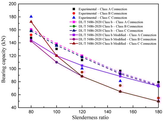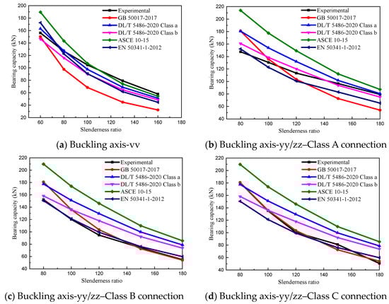 Figure 5b presents the bearing capacity curve for the buckling axis-yy/zz with a Class A connection. Calculated results by DL/T 5486-2020 Class a and ASCE 10-15 consistently surpass the experimental results, with DL/T 5486-2020 Class a exceeding the test results by 1% to 22% and ASCE 10-15 surpassing them by 10% to 45%. For a slenderness ratio below 100, GB 50017-2017 yields values higher than the experimental results, ranging from 4% to 22%, whereas for slenderness ratios higher than 100, it falls below the test results by 9% to 32%. When the slenderness ratio surpasses 80, EN 50341-1-2012 produces values lower than the experimental results, ranging from 6% to 18%. Regarding the DL/T 5486-2020 Class b, when the slenderness ratio is below 120, it exhibits values higher than the experimental results by 6% to 9%, while for slenderness ratios exceeding 120, it falls below the test results by 3% to 5%. Except for EN 50341-1-2012, the calculated results tend to be overly progressive for smaller slenderness ratios, particularly those below 100. Conversely, for larger slenderness ratios, the ASCE 10-15 and DL/T 5486-2020 Class a design codes lean towards being overly progressive, while the GB 50017-2017 and EN 50341-1-2012 codes tend to be more conservative. Therefore, during the design process, adopting the DL/T 5486-2020 Class b guidelines is recommended. It tends to be overly progressive for smaller slenderness ratios but can be appropriately adjusted, aligning closely with experimental results for larger slenderness ratios.