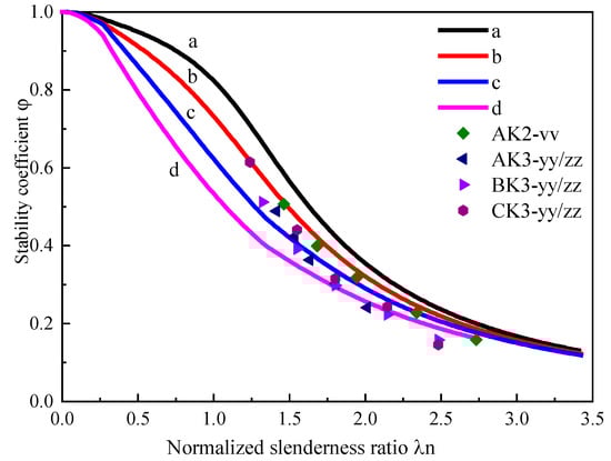 Figure 6 presents a comparison between experimental results and column curves in the design standard. Column curves “a,” “b,” “c,” and “d” represent various types of cross-sections []. The buckling axis of member AK2-vv is weak principal axis-vv, and denotes the normalized slenderness ratio. It can be observed that when is less than or equal to 1.5, the experimental results closely align with the column curve “c”. As the slenderness ratio increases, there is a gradual transition from curve “c” to curve “a.” When exceeds 1.75, it surpasses curve “a.” In the case of the buckling axis-yy/zz for the Class A connection, experimental results transition from the curve “d” to the curve “a” when the slenderness ratio is in the range of 1.0 to 2.0. When is greater than or equal to 2.0, the experimental data surpass the curve “a.” The Class B connection primarily approximates the curve “c” and gradually approaches the curve “d” as the slenderness ratio increases. The stability coefficient for members with Class C connections moves from curve “b” to curves “c” and “d” as the slenderness ratio increases. It can be seen that angle steel sections with different types of joint connections and slenderness ratios show different variation trends. Notably, the design standard appears to exhibit unsafe predictions for Class A and B connections with low slenderness ratios and Class C connections. As a consequence, a refined formula is proposed to modify the slenderness ratio.