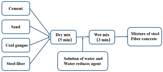 Regarding the provisions of GB/T50080-2002 [35] and GB/T50081-2002 [36], we used a total of 480, 100 mm × 100 mm × 100 mm cubic test blocks, 240, 100 mm × 100 mm × 300 mm prismatic test blocks, and 48, 100 mm × 100 mm × 400 mm prismatic test blocks. Among them, 240 cubic specimens were used for the cubic uniaxial compression test and another 240 cubic specimens were used for the split tensile test. Figure 3 shows the process used to prepare the specimens. When making the test block, first of all, sand, cement, coal gangue aggregate, steel fiber, and other raw materials were added at a certain ratio into the concrete mixer for dry mixing 5 min, then dry-mixed uniformly after adding water, and mixing was continued for 3 min. In the experimental process, we found that, if the conventional method of vibration was used, coal gangue aggregate would appear with a floating phenomenon, which would lead to the test block of the internal material not being uniform, affecting the strength of the test block. Therefore, this test was divided into two vibrations: the first half of the concrete was placed into the test mold in the vibration table for vibration, and continuous vibration was carried out until the surface was without obvious floating bubbles. Then, the other half of the concrete continued to vibrate until the surface of the test block was without obvious bubbles, and the test block surface was used for smoothing.