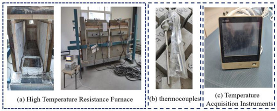 The heating procedure of the high-temperature test was set according to the international standard heating curve ISO-834 [37]. The heating device used in this test was a multifunctional resistance furnace, model ZH-252-12, with a rated power of 21 KW, and the heating rate of the furnace was set to 20 °C/min, with a maximum temperature of 1000 °C. There were 8 heating plates in the resistance furnace, according to the needs of the setup combination shown in Figure 4a. The completed test pieces were put into the resistance furnace according to the batch and heated up to 200 °C, 400 °C, 600 °C, and 800 °C, respectively. To facilitate real-time monitoring of the resistance furnace and the internal temperature of the test block, a K-type thermocouple sensor was positioned inside the furnace, with its other end connected to a temperature collector. As depicted in Figure 4b, this K-type thermocouple sensor enabled us to track the internal temperature of both the test block and the resistance furnace. Figure 4c showcases the temperature collector, model SK-A6000. Once the internal temperature of the resistance furnace attained the desired target value, the heating process was halted. After a cooldown period of 3 h, the specimen was allowed to reach room temperature before being removed. Finally, we observed the crack formation on the specimen as a result of the fire exposure.