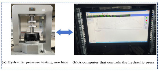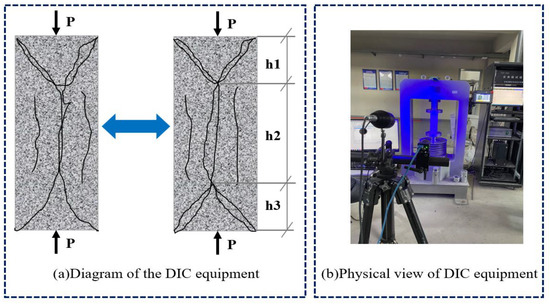 In this paper, a uniaxial compression test of prisms was also performed in strict accordance with the specification requirements of Chapter 6 in GT50081-2019 [36], and the prismatic cylinder uniaxial compression test selected YAR-600 electro-hydraulic servo press (Jilin Guanteng company, Changchun, China) as the loading device, as Figure 7 shows. The loading process of the test was controlled by the computer connected to the press, the real-time value of the load on the prism during the test as read and recorded by the computer, and the real-time displacement of the prism in the whole field during the test was measured and collected using the digital image correlation equipment (DIC). The DIC equipment consisted of an ultra-high-definition camera, fill light, calibration plate, and computer. Its workflow was to firstly collect the real-time displacement field of the test block surface, which changed with the change in load through the ultra-high-definition camera, and then to analyze and calculate the displacement field of the test block surface using special software and derive the real-time strain of the test block as a whole.