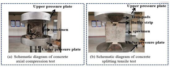 Mechanical property tests were conducted following GT50081-2019 [35]. As shown in Figure 5, the mechanical property tests were carried out on a YAW-1000 hydraulic pressure testing machine. The controlled loading rates of the tests were 0.5 MPa/s and 0.6 MPa/s. To determine the mechanical properties after high-temperature exposure, we recorded the load at the moment of specimen failure. This data were then used to calculate the cubic compressive strength and splitting tensile strength of the steel fiber coal gangue concrete. The entire testing procedure is visually represented in Figure 6.