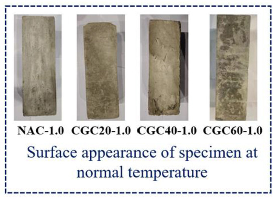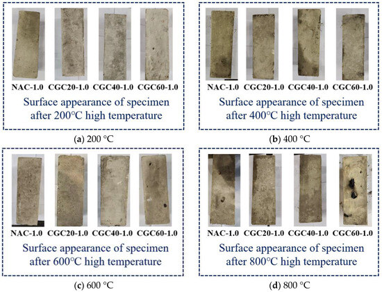 Figure 8 demonstrates the apparent condition of steel fiber coal gangue concrete specimens at ordinary temperatures. Figure 9 shows the apparent condition of NAC-1.0, CGC20-1.0, CGC40-1.0, and CGC60-1.0 specimens after going through different temperatures. Comparing Figure 8 and Figure 9 shows that the surface cracks on the specimens after firing were mainly caused by the temperature difference between different parts of the specimens during firing. The colors of the specimen surface were similar at 600 °C and 800 °C, and the appearance of the CGC60-1.0 specimen surface was concomitant with the exposure of the coal gangue coarse aggregate. In addition, Figure 9 shows that the SFCGC had a certain degree of edge bursting around 800 °C, which indicates that the steam pressure generated in the high temperature led to a steeper temperature gradient inside the specimen. The SFCGC had a low tensile strength, and although steel fibers were added, the steel fibers were not effective in preventing the bursting phenomenon in the case of rapid warming up to 800 °C. In addition, Sideris et al. [38] also showed that steel fibers do not prevent the high-temperature bursting phenomenon of concrete, which is also consistent with the experimental phenomena in this paper.