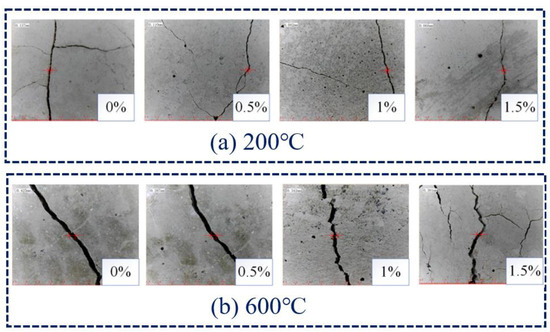 Figure 10 shows the comparison of the crack widths of SFCGC20 specimens with different steel fiber volume contents at fire temperatures of 200 °C and 600 °C. It can be seen that at the same steel fiber volume content, the higher the temperature, the more cracks there were on the surface of SFCGC20-1.0. It can be seen that with the same amount of steel fiber doping, the ignition temperature was higher, there were more cracks on the surface of the test block, there was a larger maximum crack width, and the temperature increased from 200 °C to 600 °C, making the SFCGC20-1.0 test block surface’s maximum crack width increase by 4.17 times. The ignition temperature was the same; the larger the amount of steel fiber doping, the fewer cracks on the surface of the test block, and the smaller the maximum crack width. The increase in steel fiber doping from 0% to 1.5% at a fire temperature of 600 °C reduced the maximum crack width on the surface of the specimen by 29%, which was because the steel fibers in the specimen effectively limited the development of cracks through the bridging effect.