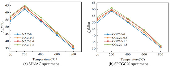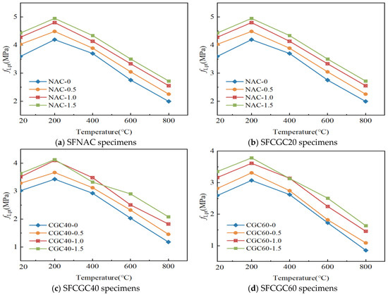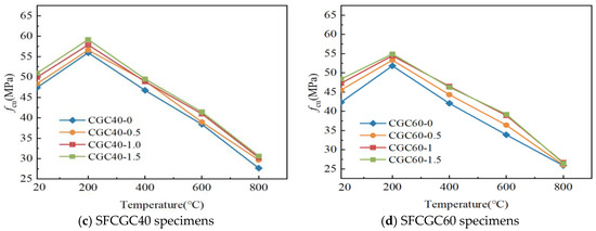 Figure 12 analyzes the residual compressive strength of SFCGC subjected to high-temperature damage as affected by steel fiber content. From the analysis in Figure 12, it is clear that the residual compressive strength decreases in general due to increasing temperature, but increases at 200 °C. The primary cause of this phenomenon is that when the temperature reaches 100 °C, the evaporation of both free and bound water in concrete creates numerous microscopic voids within its structure, thereby diminishing its overall strength [39]. However, as the temperature continues to escalate, the water–cement ratio decreases, activating the coal gangue and accelerating the hydration reaction within the concrete, subsequently enhancing its strength. Nevertheless, when the temperature surpasses 200 °C, the hydration products within the concrete start to decompose, and the carbon content in the coal gangue burns. Additionally, the deformation of various substances at such high temperatures becomes uncoordinated, causing significant stress differences and minimal shape variations, ultimately leading to the cracking of the CGC specimen and a decrease in the strength of SFCGC.