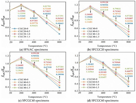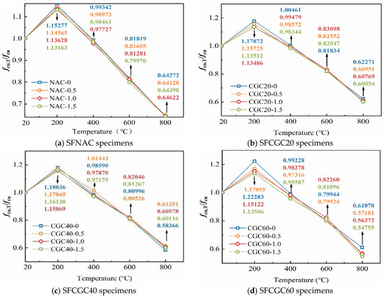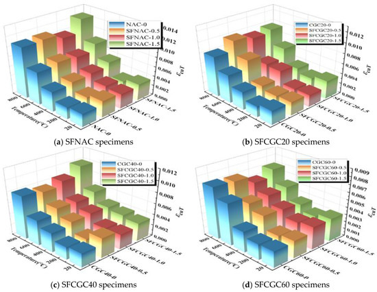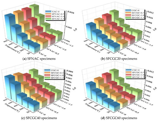 As Figure 19 illustrates, the integration of steel fibers into concrete contributes to mitigating thermal damage and enhancing the material’s toughness, ultimately leading to an augmentation in its peak strain. Notably, for fire temperatures below 400 °C, the trend of peak strain enhancement remains comparable to that observed at room temperature. However, once the fire temperature surpasses 400 °C, the increment in peak strain diminishes significantly compared to its room temperature counterpart. Further analysis reveals that the peak strains of NAC-1.0, SFCGC20-1.0, SFCGC40-1.0, and SFCGC60-1.0 specimens increased by 250%, 177%, 174%, and 122%, respectively, compared to their room temperature counterparts. This observation suggests that an increase in the coal gangue substitution rate diminishes the extent of peak strain enhancement following exposure to high temperatures, indicating the relatively superior refractory properties of coal gangue aggregate.