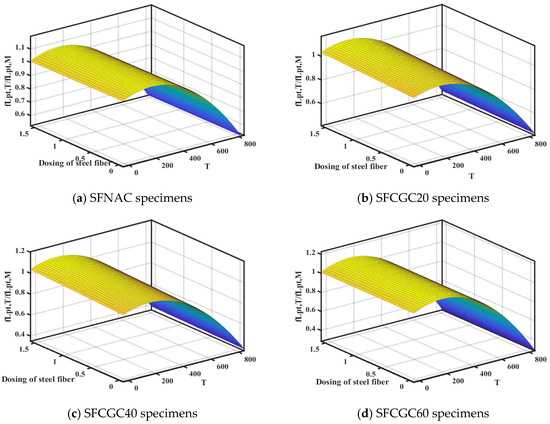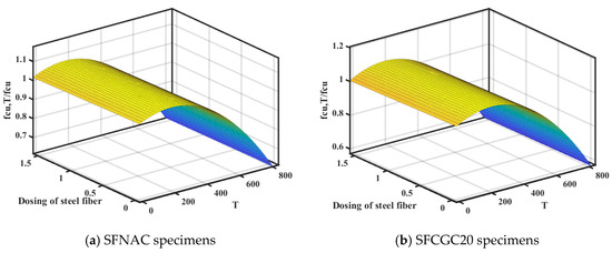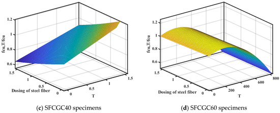 By fitting the relative compressive strength test results using MATLAB software 9.2.0.538062 (R2017a), we obtained the variation in the cubic compressive strength of high-temperature SFCGC and SFNAC with the experienced temperature and the influence law of the two parameters of steel fiber volume content, as shown in Table 4 and Figure 14. In Table 4, R2 represents the accuracy coefficient of the prediction model, which is calculated as shown in Equation (2)–(5), and the closer the value of R2 is to the value of 1, the higher the accuracy of the proposed model is. It can be concluded from Table 4 that the experimental values are in good agreement with the fitted values. In addition, compared with the cubic polynomial function model for steel fiber fragmented aggregate concrete (SFSAC) with single control of compressive strength through fire temperature after experiencing high temperatures studied by Cai B [25], the composite function model proposed in this paper is able to better predict the compressive strength of SFCGC under the influence of two parameters, namely, the volume content of steel fibers and the fire temperature. The prediction model accuracy coefficients R2 are all greater than 0.9.