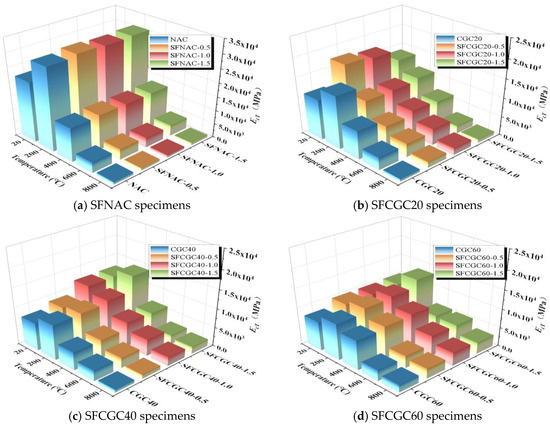 In the present study, the elasticity modulus is defined as the cut line modulus corresponding to the 40% peak stress point observed in the ascending phase of the concrete’s stress–strain curve following exposure to high temperatures [25]. Figure 15 depicts the influence of high-temperature degradation on the elastic modulus of SFCGC.