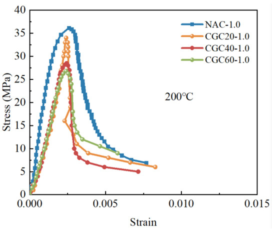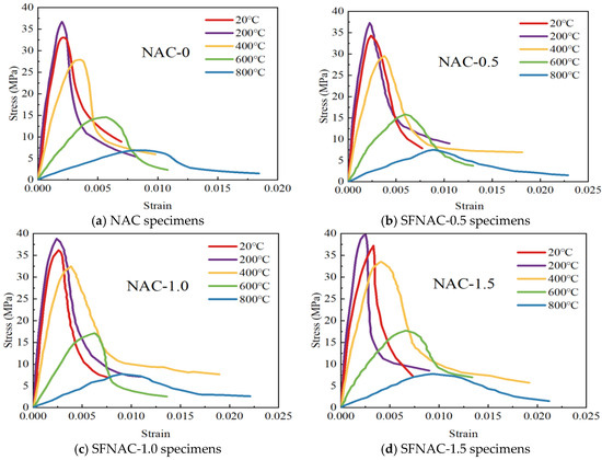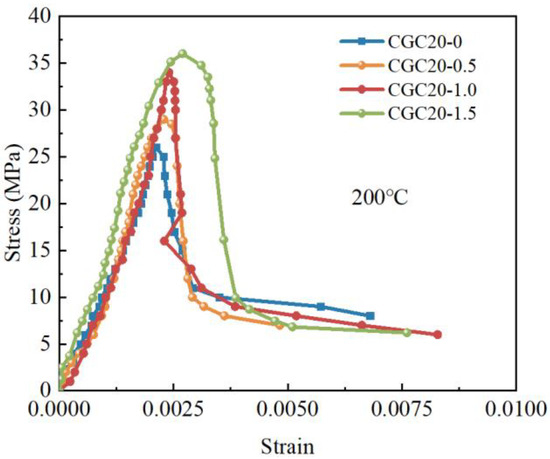Upon analysis of Figure 26, it becomes apparent that the influence of steel fiber volume content on the evolution of the stress–strain curve exhibits a general similarity. Specifically, taking the coal gangue concrete stress–strain curve under varying steel fiber contents after exposure to a high temperature of 200 °C as a case in point, we observe that the initial ascending phase of the curve does not exhibit significant variation with increasing steel fiber content. This suggests that the steel fibers do not play a notable role in the elastic phase of the specimen. However, as the strain progressively increases, it becomes evident that the peak point of the stress–strain curve gradually shifts towards the right with an augmentation in steel fiber doping. This shift indicates that the incorporation of steel fibers has a mitigating effect on the brittle failure tendency of the concrete.