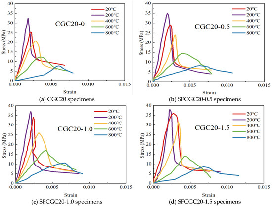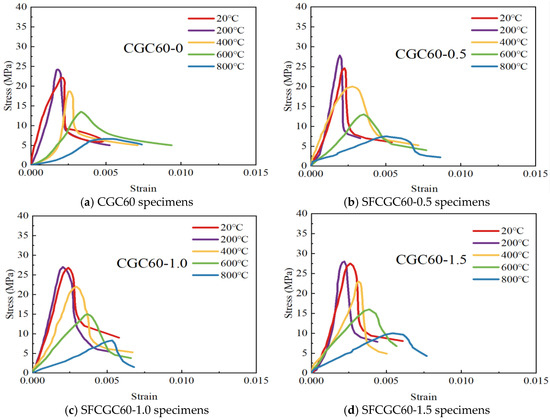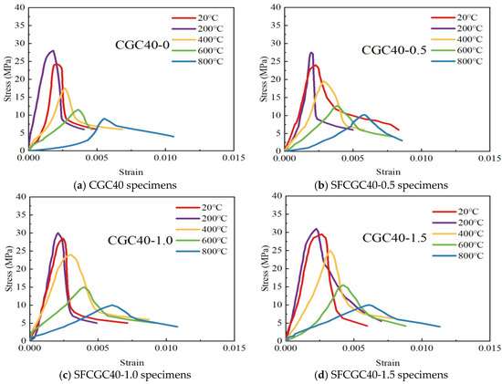 (5) The comprehensive stress–strain curve of SFCGC post-high temperature exposure exhibits distinct characteristics: a decline in peak stress, an augmentation of peak strain, a diminished modulus of elasticity, and a flattening trend of the curve itself. Moreover, SFCGC subjected to 200 °C temperatures exhibits a remarkable compaction effect during the initial compression phase, resulting in a concave shape in the initial ascending segment of the stress–strain curve. Notably, the inclusion of steel fibers significantly enhances the ductility and mitigates brittleness in SFCGC following high temperatures.