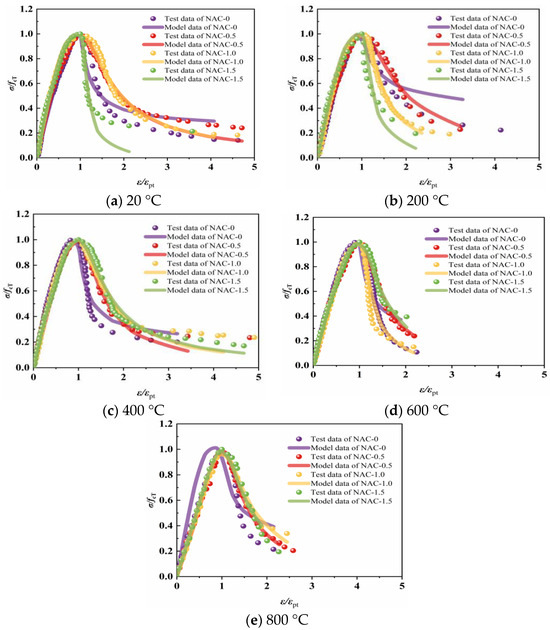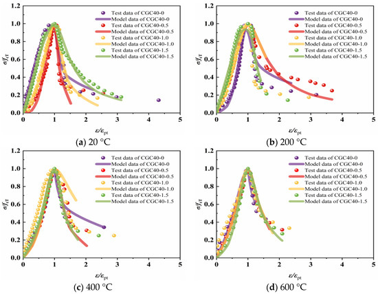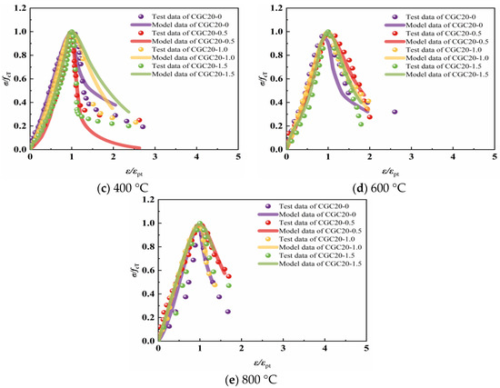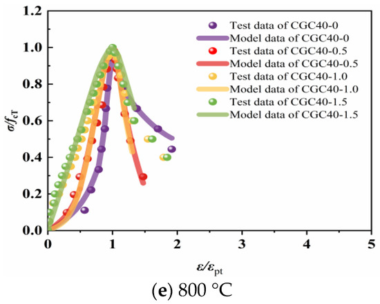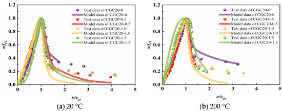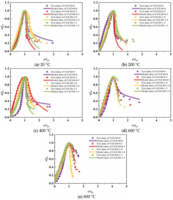 With the increase in the steel fiber volume content, the α value increases and the β value becomes smaller, indicating that the initial slope of the rising section becomes larger and the falling section becomes flat, and the envelope area of the stress–strain curve with the horizontal axis increases, which indicates that the steel fiber can improve the brittleness and increase the toughness and ductility of CGC. For the same kind of concrete, with the increase in temperature, the α value decreases rapidly, while the β value increases gradually, indicating that the peak load and deformation modulus in the ascending section are significantly reduced. The peak strain and ultimate strain are increased rapidly while the descending section becomes flat, and the plastic deformation capacity becomes larger, but the area encompassed by the curve decreases and the absorbed energy of the specimen is reduced in the case of damage.
