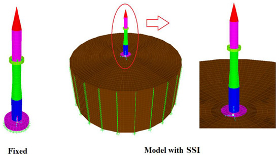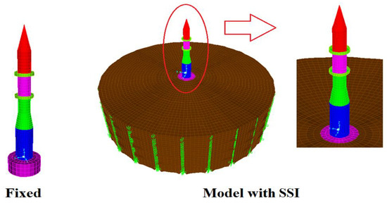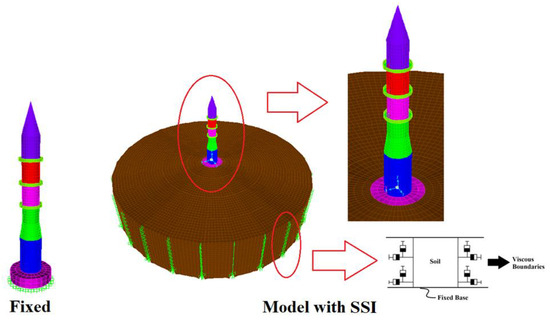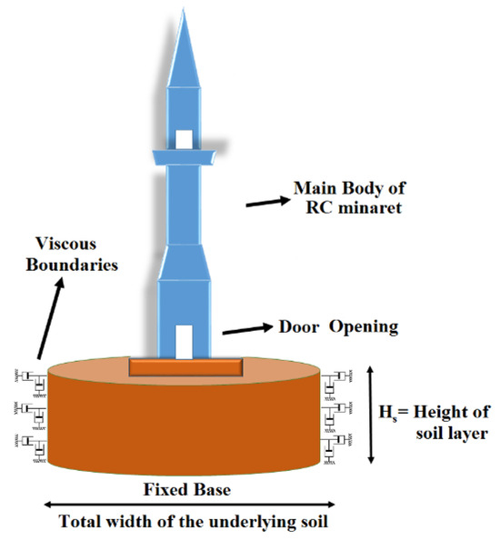 The problem of regenerating the infinite underlying soil beneath the RC minarets can be solved by modeling the near-field soil with solid finite components and accounting for the remaining infinite soil by adding artificial bounds to the end of the near field, as shown in Figure 7. These kinds of boundaries can be used to prevent the propagating waves from the structural foundation layer from reflecting and radiating [40].