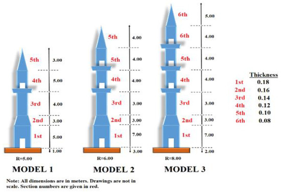 The finite element models of three representative minarets were produced by using the SAP2000 structural analysis program. The finite element models of these three representative minarets are given in Figure 2, Figure 3 and Figure 4. Models 1, 2 and 3 have one, two and three balconies, respectively. Additionally, Models 1, 2 and 3 each have two, three and four door holes. The first of these holes serves as an entrance, while the remaining openings are situated at the balcony level. The door holes on all models have rectangular shapes and are 1.50 m in height. Furthermore, at the designated heights, the breadth of door openings forms an arc length that circumscribes a 30° angle. All of the models have foundations embedded in the underlying soil. The foundation sizes for Models 1, 2 and 3 are, in radius–depth, 5.00–1.00 m, 6.00–3.00 m and 8.00–2.00 m, respectively. It is assumed for all typical models that the soil is 20 m thick and that once the soil reaches this height, it is anchored to the main rock and can be considered firm. Additionally, it is considered that the soil underneath the structures is homogeneous. The foundations and superstructures of the representative models were constructed using RC. The assumptions made for the material’s parameters included unit weight, Young’s modulus, Poisson’s ratio, and concrete compressive strength (which is typically utilized in practice) of 23.5 kN/m3, 30,000 MPa, 0.2 and 16 MPa, respectively. Compressive strength is a typical value among these properties that is most frequently seen in everyday circumstances.