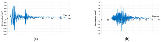 Two recorded ground motions from the 17 August 1999 Mw 7.4 İzmit earthquake and the 23 October 2011 Mw 7.2 Van earthquake were applied to the minaret models [45] in the dynamic modal time history analysis. The time histories of the mentioned ground motions are shown in Figure 6.