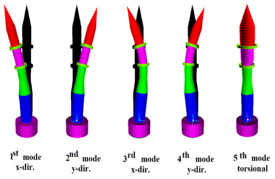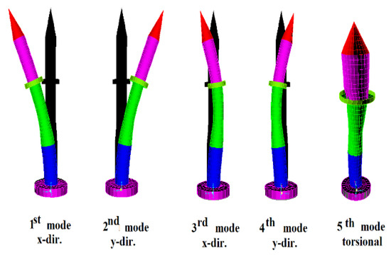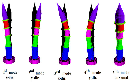 The first four mode shapes for the representative minarets under consideration are in the x and y directions, whereas the fifth mode is torsional, as seen in Figure 9, Figure 10 and Figure 11. Also, the cumulative sum of modal participating mass ratios for the first nine modes are provided in Table 3.