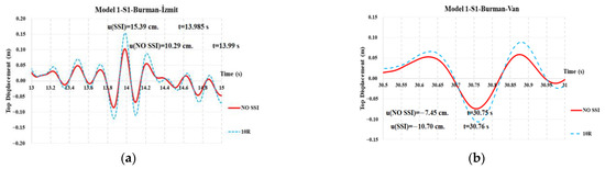 The top displacements of the structure are another significant characteristic that needs to be considered while analyzing the dynamic seismic response of RC minarets. This section of the study represents the top displacements of the representative minarets under the Van and İzmit earthquakes for various soil types. For the S1 (stiff) type of soil, the top displacements for the representative minarets are given in Figure 12, Figure 13 and Figure 14. Additionally, the full durations of the listed earthquakes are not shown in the following figures due to the impossibility of obtaining both visible and feasible comparisons. As a result, only the effective duration intervals that produce the greatest response for the representative minarets as determined by the Burman et al. [44] method are displayed.