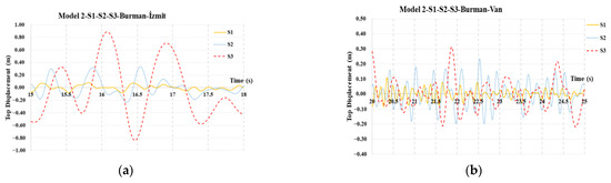 Top displacements of Model 2 for soft soil: (a) İzmit earthquake and (b) Van earthquake.