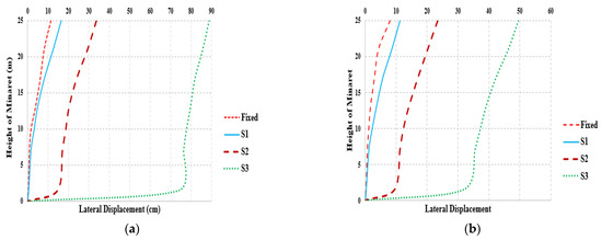 In the current technical literature, as specified in [18,30], there is no specialized design code or specification for the design or structural analysis for RC minarets, especially in the performance evaluation. Therefore, the design codes specialized for RC chimneys (tall and special structures like RC minarets) can be utilized in the design, structural analysis and performance evaluation of RC minarets. According to [47], in the section “Specific Rules for RC Chimneys”, it is stated that the requirement for damage limitation is considered to be satisfied if the lateral displacement of the top of the structure does not exceed 0.5% of the height of the structure. In this damage limitation state, permanent deformations of the structure are not desired. Also, without the need for structural repairs, the structural parts ought to maintain their original stiffness and strength. Moreover, for the models considered, the interstory drift ratios (IDRs) are obtained and provided in Table 4 in comparison with the damage limitation state value of 0.005.