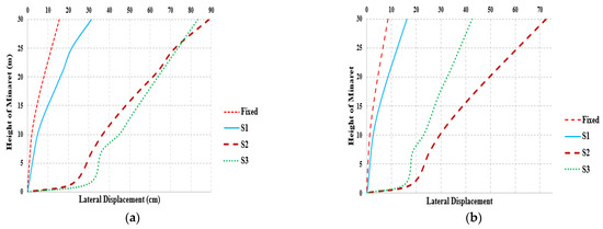Table 2 is given graphically in Figure 8. It is clear from Table 2 and Figure 8 that as the height of the minaret increases, the first-mode period increases for all cases. Also, considering SSI in the dynamic analyses increased the first-mode periods of the representative minarets when compared with the fixed-base model. It illustrates how crucial it is to take SSI into account when analyzing the RC minarets’ dynamic seismic response.