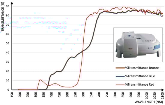 35]. Even if the films are of different colours, their transmittance curves could be similar if their thickness and interference effects at specific wavelengths are comparable, whilst the red one has a lower transmittance between 400 and 600 nm of wavelength.