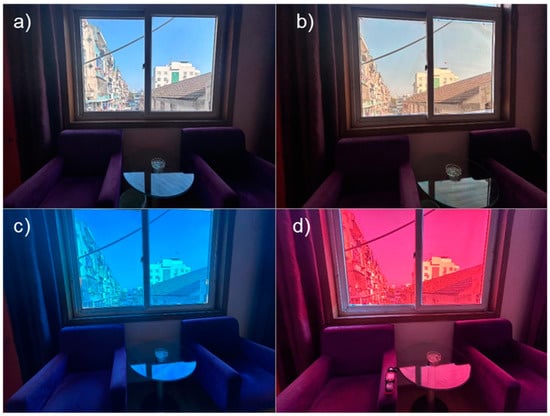 Since chromogenic windows come in various colours with differing stimuli and transmittance levels, we collected films to simulate their typical conditions—clear, brown, blue, and red—to control variables for more reliable and effective results. These colours represent typical thermochromic, electrochromic, and red luminescent solar concentrating windows [