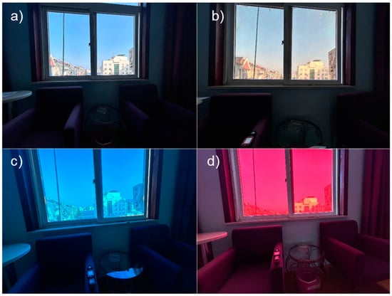 Four window states were set up by applying tinted films to the inner surface of the windows in the experimental rooms. Four window conditions were assigned to each floor, including clear, bronze, blue, and red. As shown in