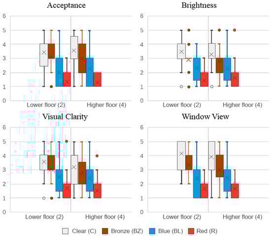 Figure 4 presents the boxplots for responses to questions Q13, Q2, Q3, and Q8, which address the acceptance of the environment affected by tinted windows, overall brightness, visual clarity, and views outside. The distribution patterns for the lower floors (C2, BZ2, BL2, and R2) closely mirror those of the upper floors (C4, BZ4, BL4, and R4). Pairwise comparisons of the same-coloured windows across different floor levels show no significant differences (