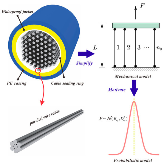 As depicted in Figure 3, the strength of a bundle of parallel wires can be evaluated through the application of a parallel system model (mechanical model) [33]. In cases where the number of components in the system () exceeds 150, the strength of the parallel system demonstrates a normal distribution with a mean value
